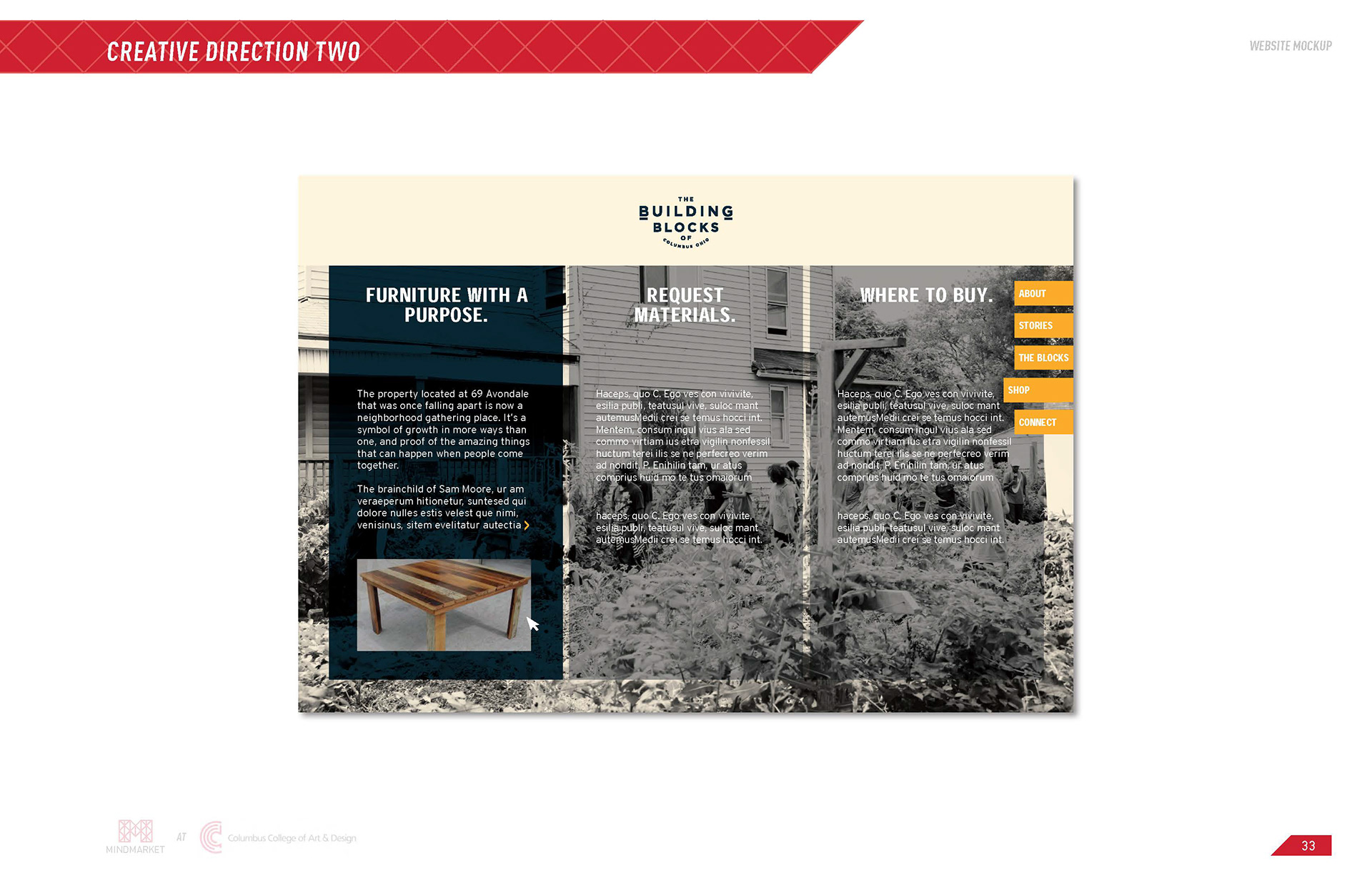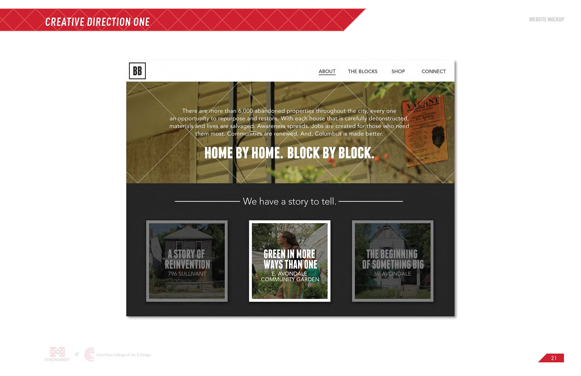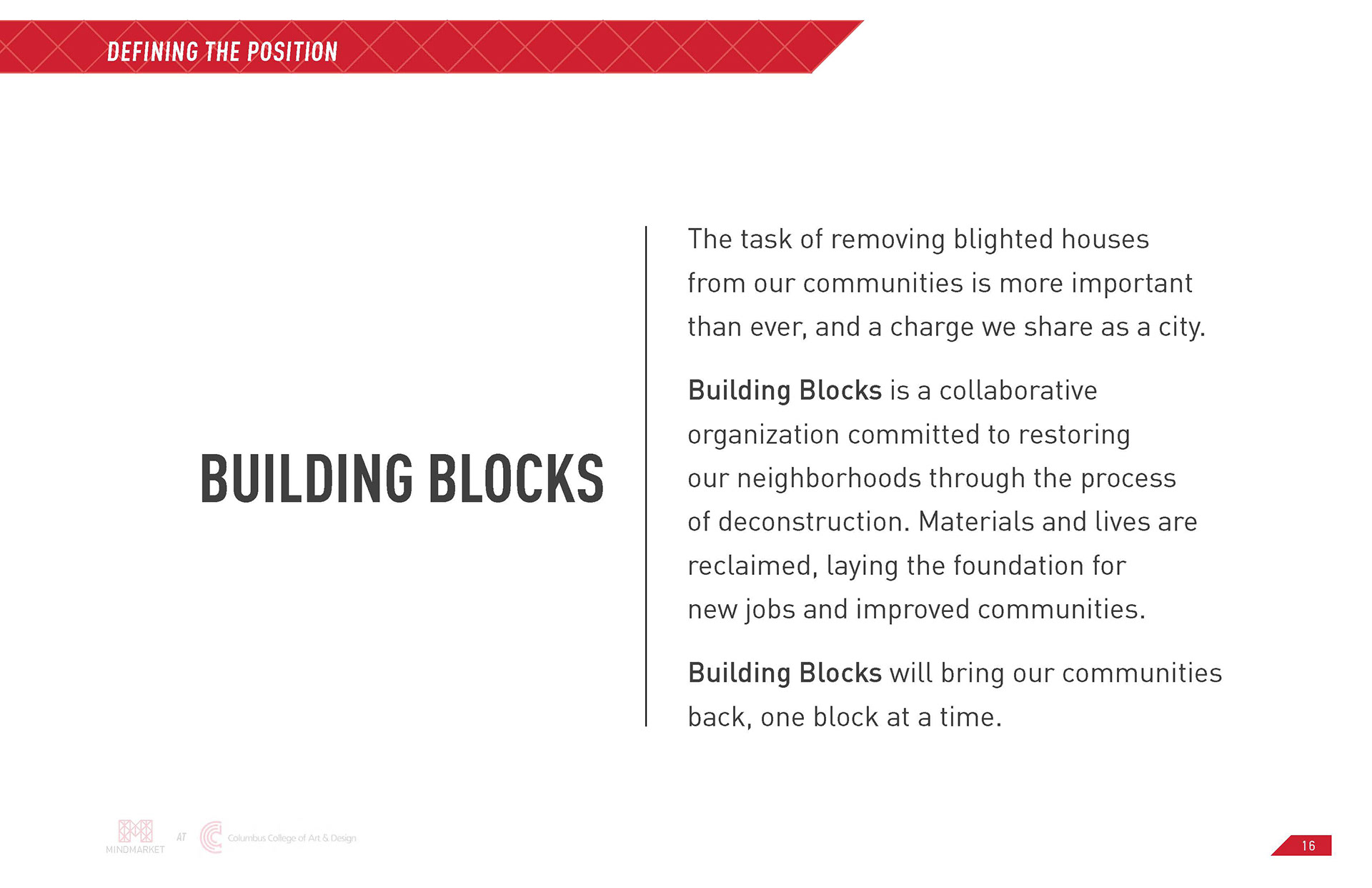 Building Blocks is a collaborative initiative between CCAD's MindMarket and Ologie with the objective of branding and marketing waste material from deconstructed abandoned homes in Columbus, Ohio. The project was sponsored by the Community Development Coalition, a local nonprofit.