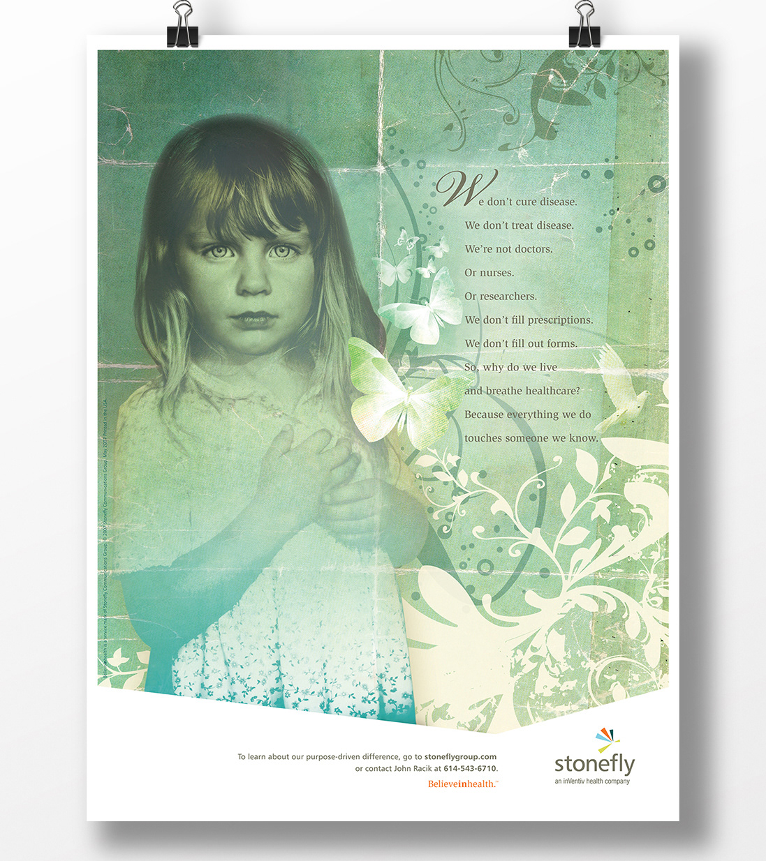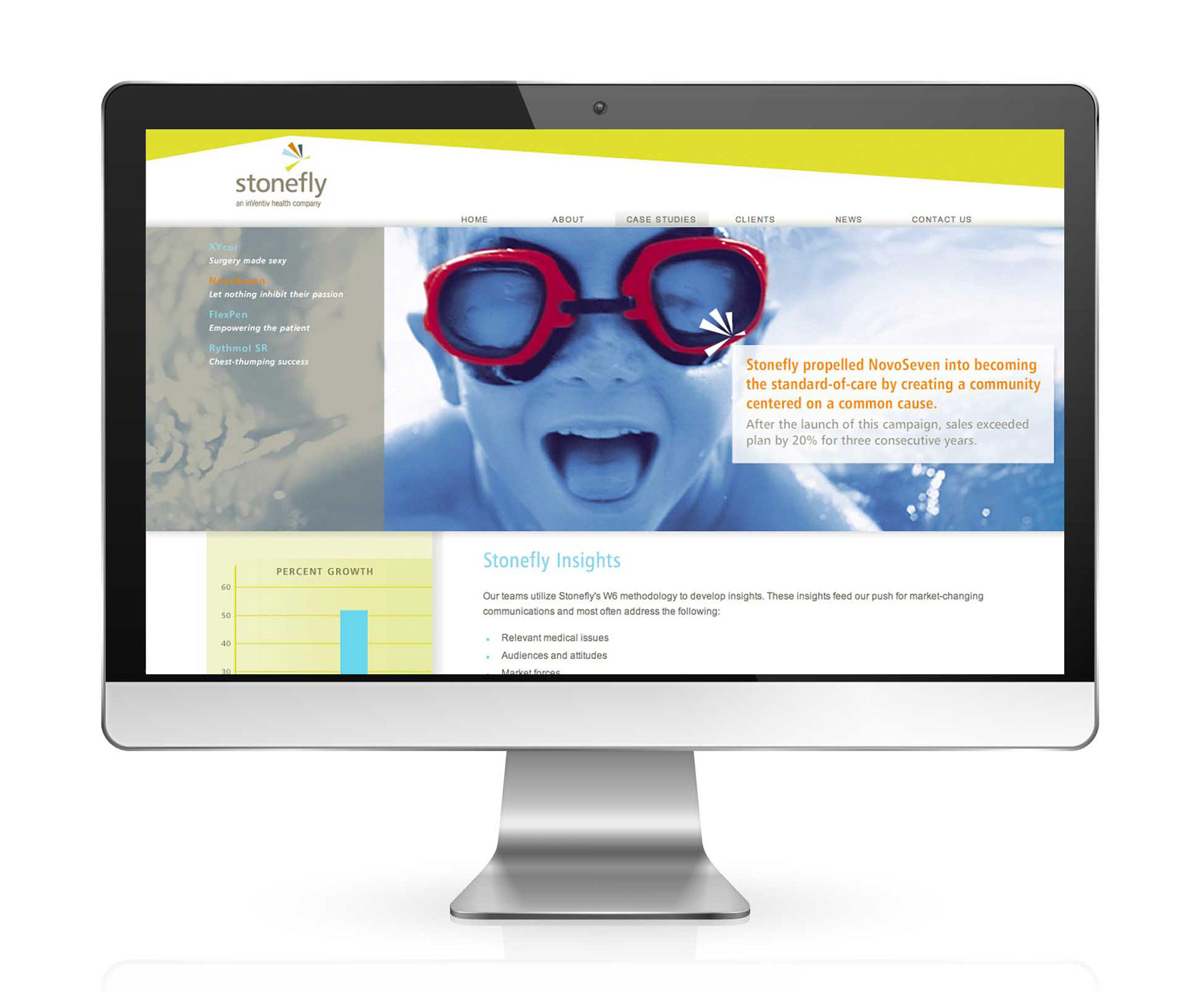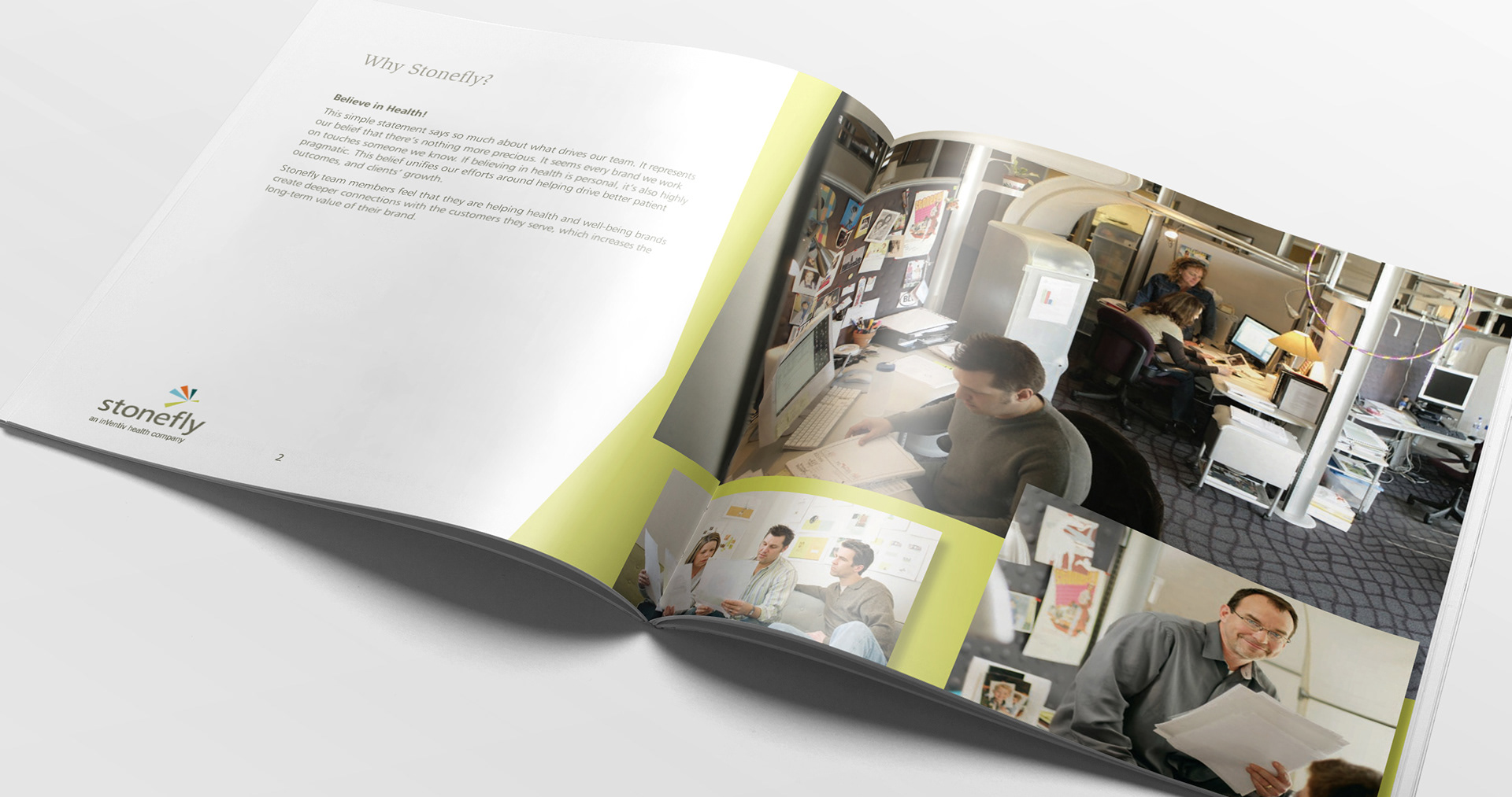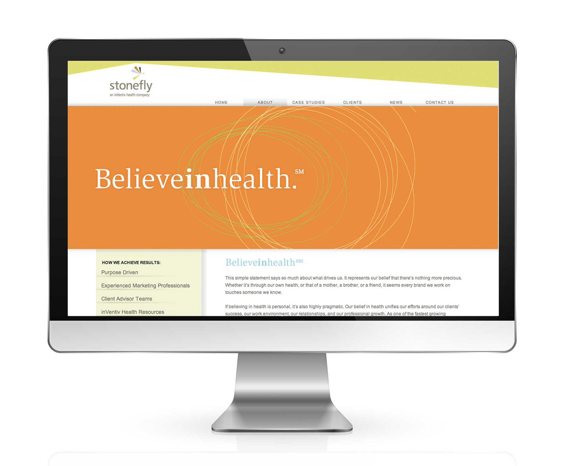 Positioning, branding, and promotion of agency. MANIFESTO No one loves this business more than we do. Some of the reasons are obvious...a paying job that is intellectually challenging. A growing and stable environment. An opportunity to express ourselves creatively. Yet, like any business, our lives are filled with memos, meetings, and mind-numbing travel. Years are spent on projects that never see the light of day. And in some circles, pharmaceutical marketing is seen as superficial, profit-driven, and opportunistic. But for us, the true rewards are not the ones that we see on a frequent basis. In fact, what we love about this business is something that we rarely see at all. Our true reward...the thing that gets us up early in the morning and lets us sleep at night...is the knowledge that somewhere, at some point in time, there's a grandfather, aunt, daughter or loved one who is benefiting from our client's medicines that we work so hard to promote. Somewhere at tha end of all the mountains of paperwork and presentation boards, is a person who is enjoying a birthday, wedding, or anniversary with their loved ones. Someone is leading a healthier and more rewarding life. And that is something we love. Something we can believe in. Stonefly Communications Believe in health Stonefly Credits: The great John Racik, founder and CEO, as well as everyone who ever worked at Stonefly.