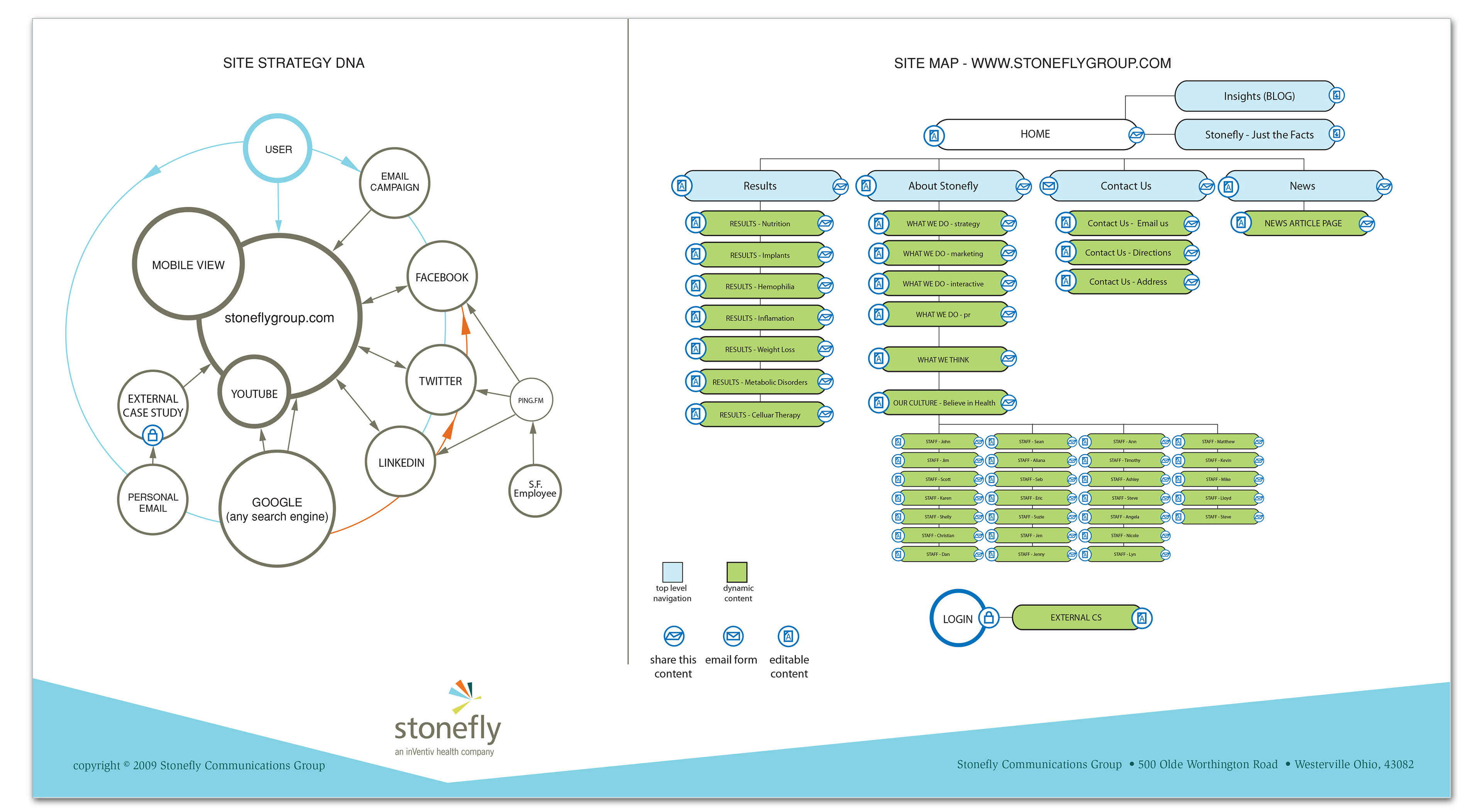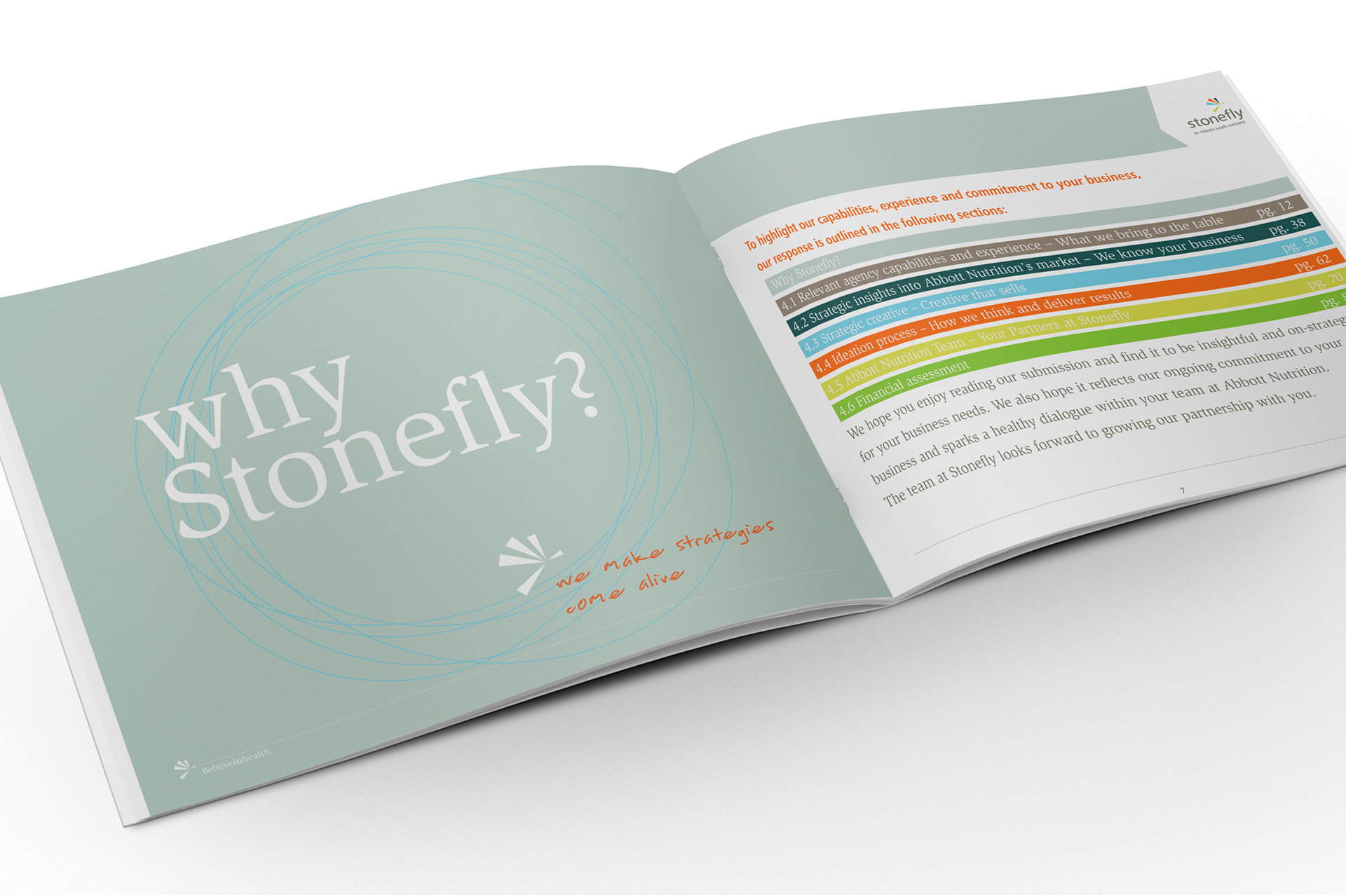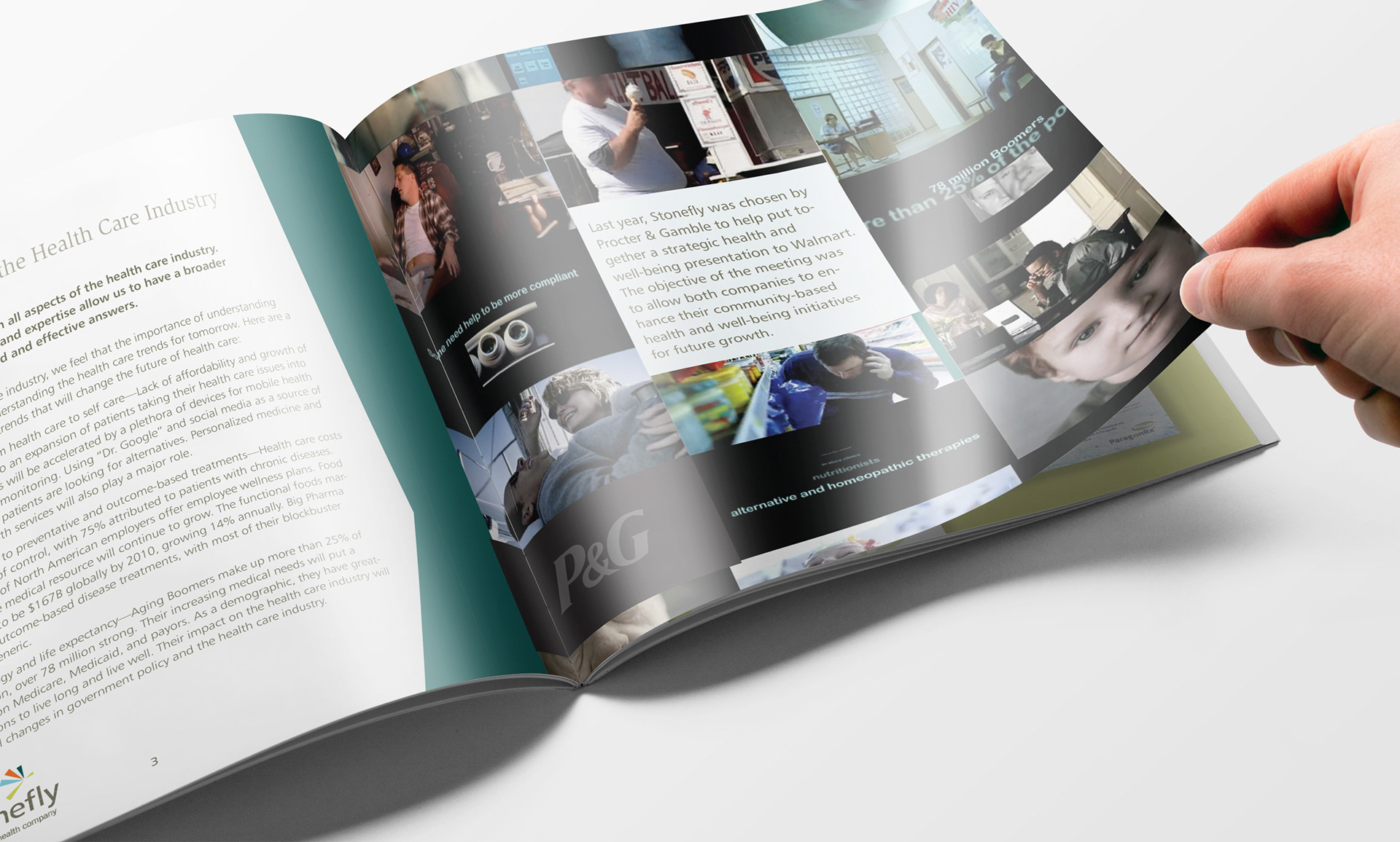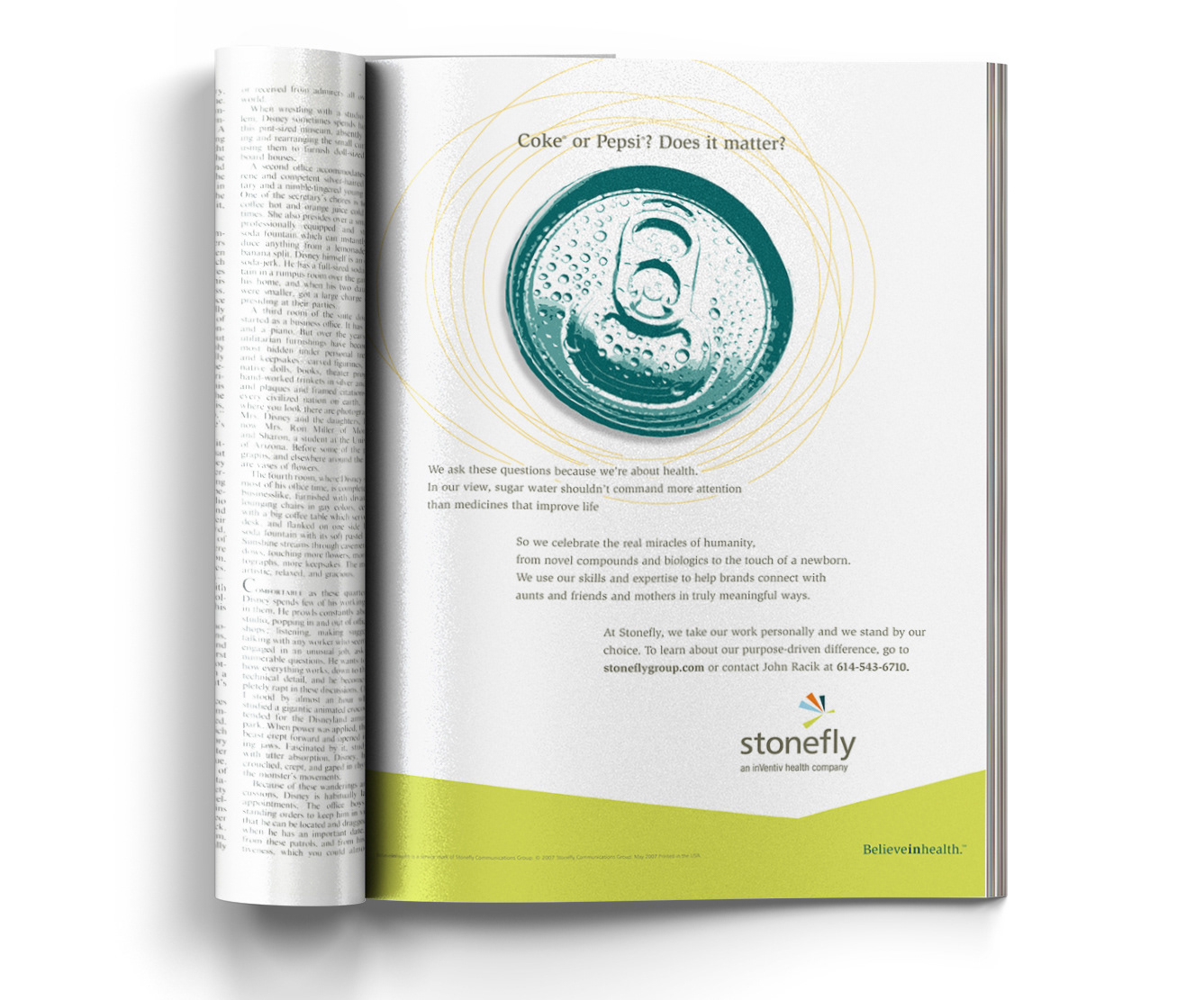 Positioning, branding, and promotion of agency. MANIFESTO No one loves this business more than we do. Some of the reasons are obvious...a paying job that is intellectually challenging. A growing and stable environment. An opportunity to express ourselves creatively. Yet, like any business, our lives are filled with memos, meetings, and mind-numbing travel. Years are spent on projects that never see the light of day. And in some circles, pharmaceutical marketing is seen as superficial, profit-driven, and opportunistic. But for us, the true rewards are not the ones that we see on a frequent basis. In fact, what we love about this business is something that we rarely see at all. Our true reward...the thing that gets us up early in the morning and lets us sleep at night...is the knowledge that somewhere, at some point in time, there's a grandfather, aunt, daughter or loved one who is benefiting from our client's medicines that we work so hard to promote. Somewhere at tha end of all the mountains of paperwork and presentation boards, is a person who is enjoying a birthday, wedding, or anniversary with their loved ones. Someone is leading a healthier and more rewarding life. And that is something we love. Something we can believe in. Stonefly Communications Believe in health Stonefly Credits: The great John Racik, founder and CEO, as well as everyone who ever worked at Stonefly.